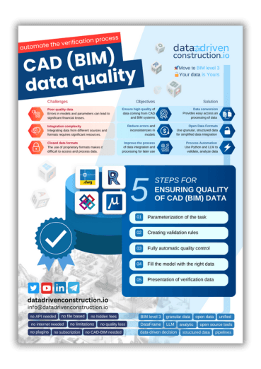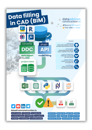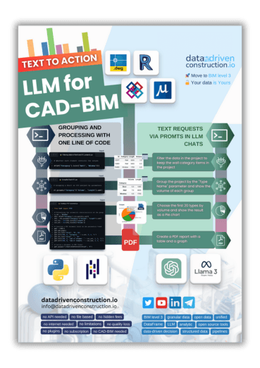 Revit®, IFC, DGN, and DWG models are created by one specialist, but dozens rely on their data. Optimizing data flow is crucial, and tools like ChatGPT can streamline this process. The DataDrivenConstruction converter and LLMs automate data handling, reducing manual work and boosting efficiency in CAD (BIM) projects.