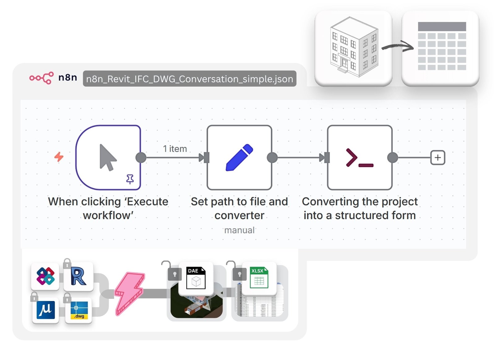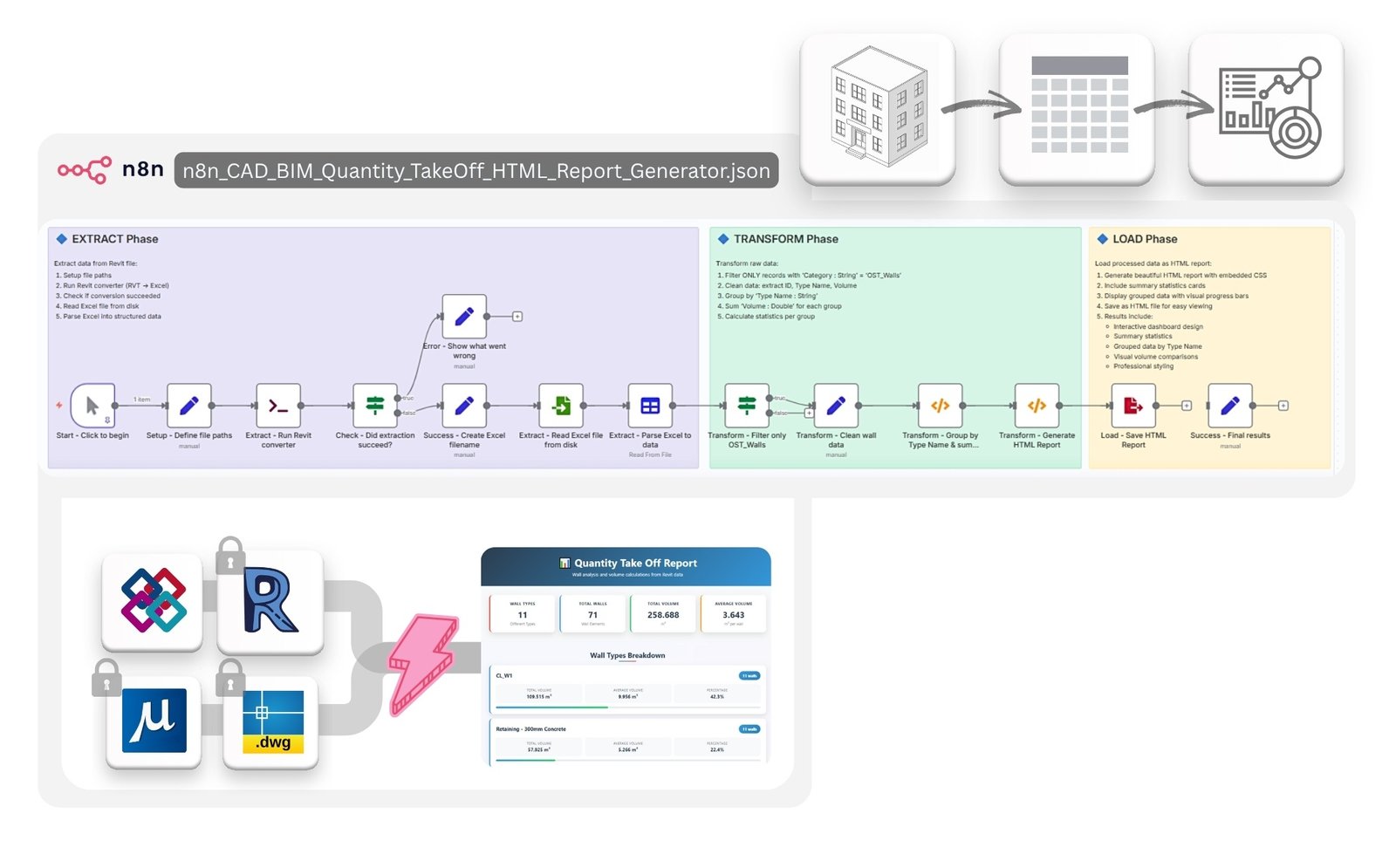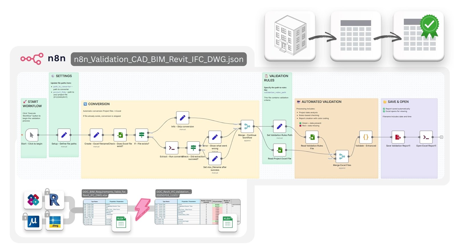 n8n workflows + Jupyter notebooks for validation, QTO, cost estimation, AI classification, and more.